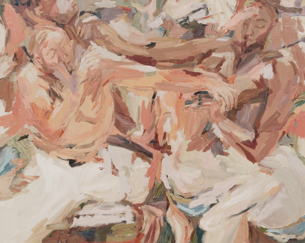 Though painting from the vastness of the universal perspective, Mia incorporates autobiographical elements into her work, often deriving human forms from people existing in her life. This blending of the micro and macro is one of many dualities that make the work so enticing. We may also spot a contrast when calling into question the serenity of the work - considering the processes through which it comes into being, and the complexities of the human essence it promotes, an unnerving sense of tension, of violence, exists in the shadows. Mia’s bodies are vessels for stored trauma, sites that witness the full spectrum of life’s euphoria and tragedy.