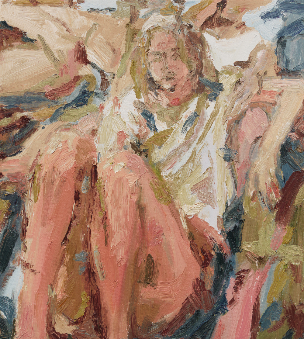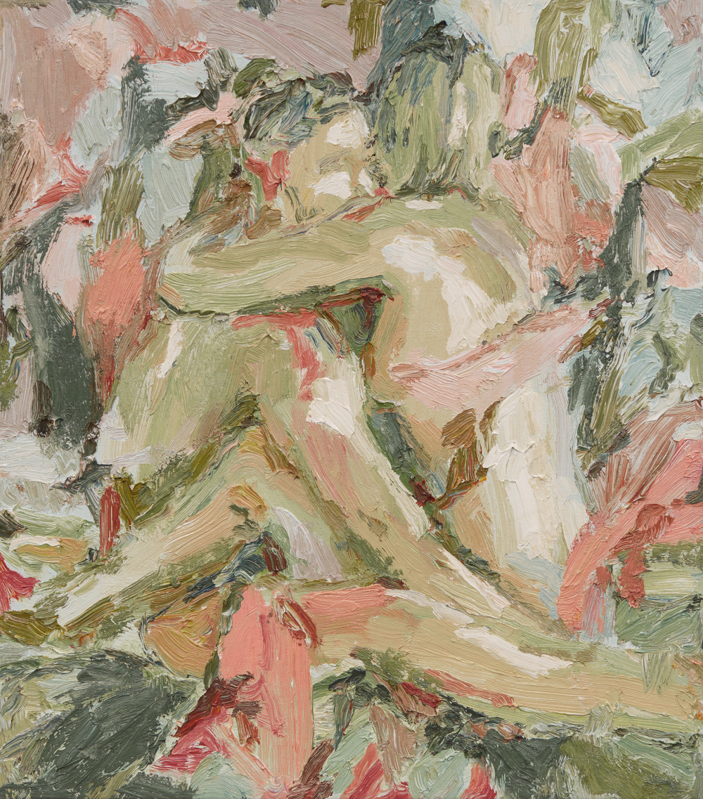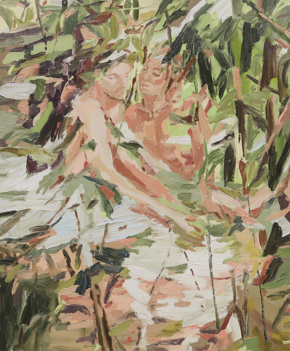 Mia’s technique, resting heavily on impasto painting and bold brushwork, unifies the bodies within her intoxicating environments. A uniform tonality helps break down the boundary between person and place, leading us to believe there is a force at work that binds them together - their emotions are caught in leaves, their thoughts in the wind. In applying lines of tension into every corner of the work, Mia encourages a full exploration of her paintings that spills from the figures in the foreground to the settings they reside within, with little suggestion of distinction between them.