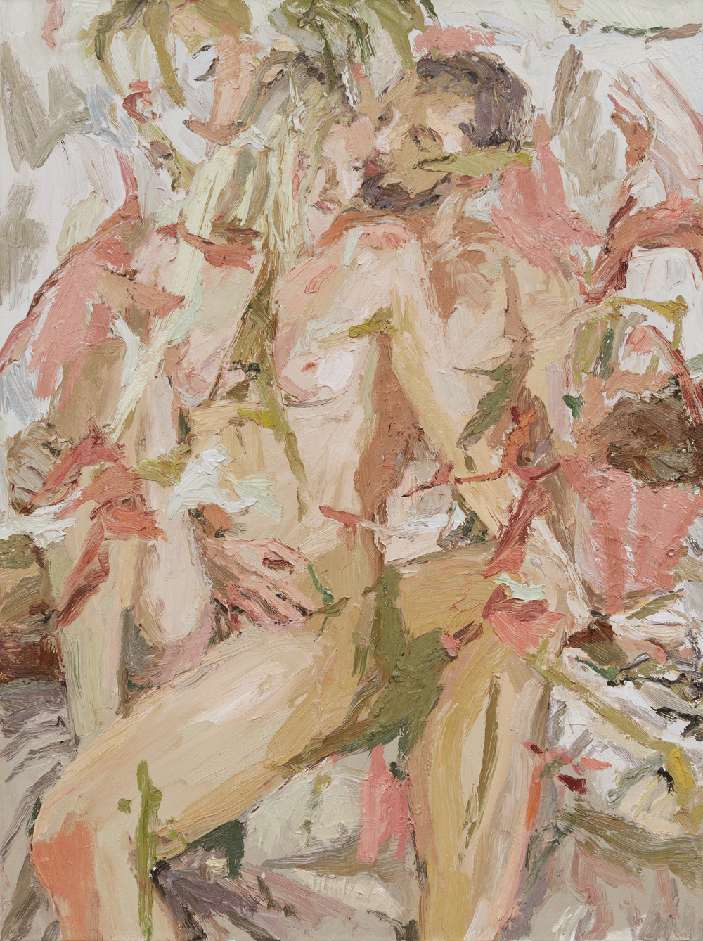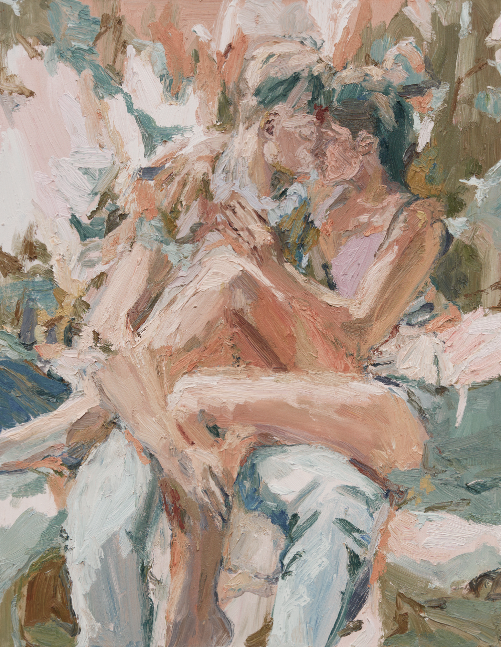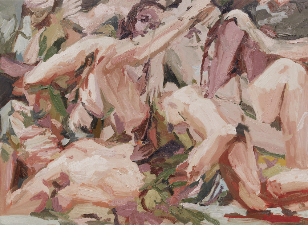 Mia’s technique, resting heavily on impasto painting and bold brushwork, unifies the bodies within her intoxicating environments. A uniform tonality helps break down the boundary between person and place, leading us to believe there is a force at work that binds them together - their emotions are caught in leaves, their thoughts in the wind. In applying lines of tension into every corner of the work, Mia encourages a full exploration of her paintings that spills from the figures in the foreground to the settings they reside within, with little suggestion of distinction between them.